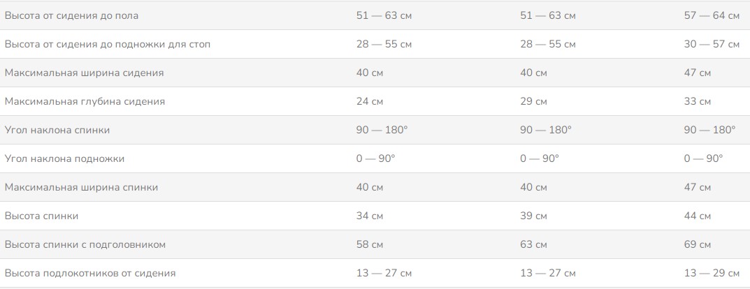 | Параметры | 1 размер | 2 размер | 3 размер |